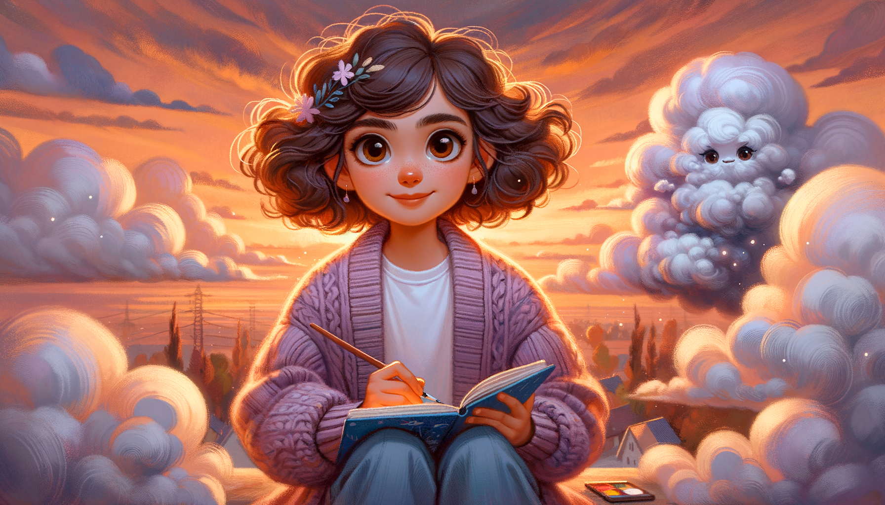 One evening, Mira sat on her roof watching the sunset. A small cloud floated right up to her!