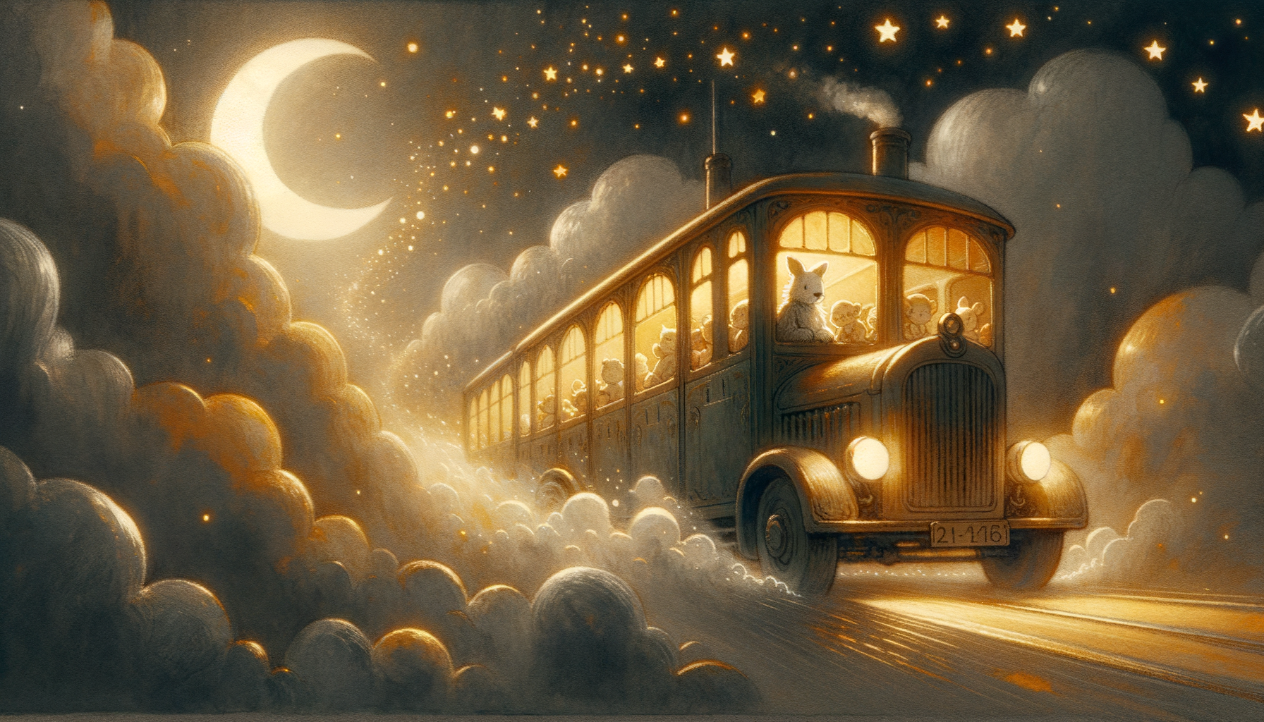 The bus is silver and glows faintly in the moonlight. The driver tips his hat to anyone still awake.
