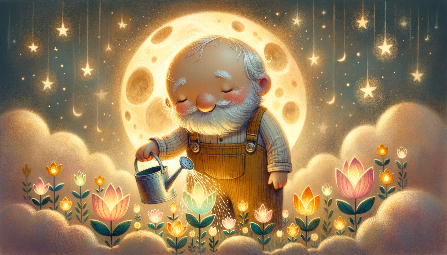 When children fall asleep, Mr. Moon walks through his garden with his silver watering can.