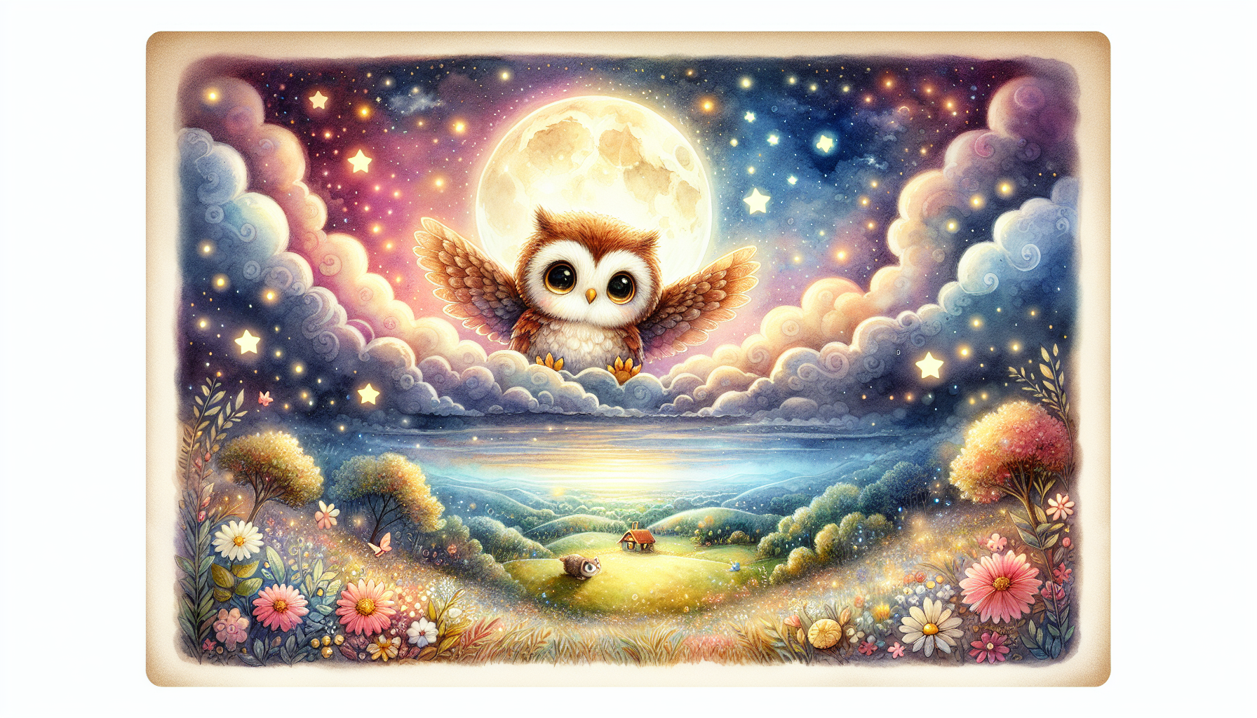 Once upon a time, in a gentle forest, a little owl named Ollie was ready for a magical nighttime adventure. As the sun dipped below the trees, Ollie fluffed his soft feathers and took a deep breath of the cool night air. The sky turned dark blue, and twinkling stars began to peek out like tiny diamonds. With a joyful hoot, Ollie spread his wings and soared into the night.