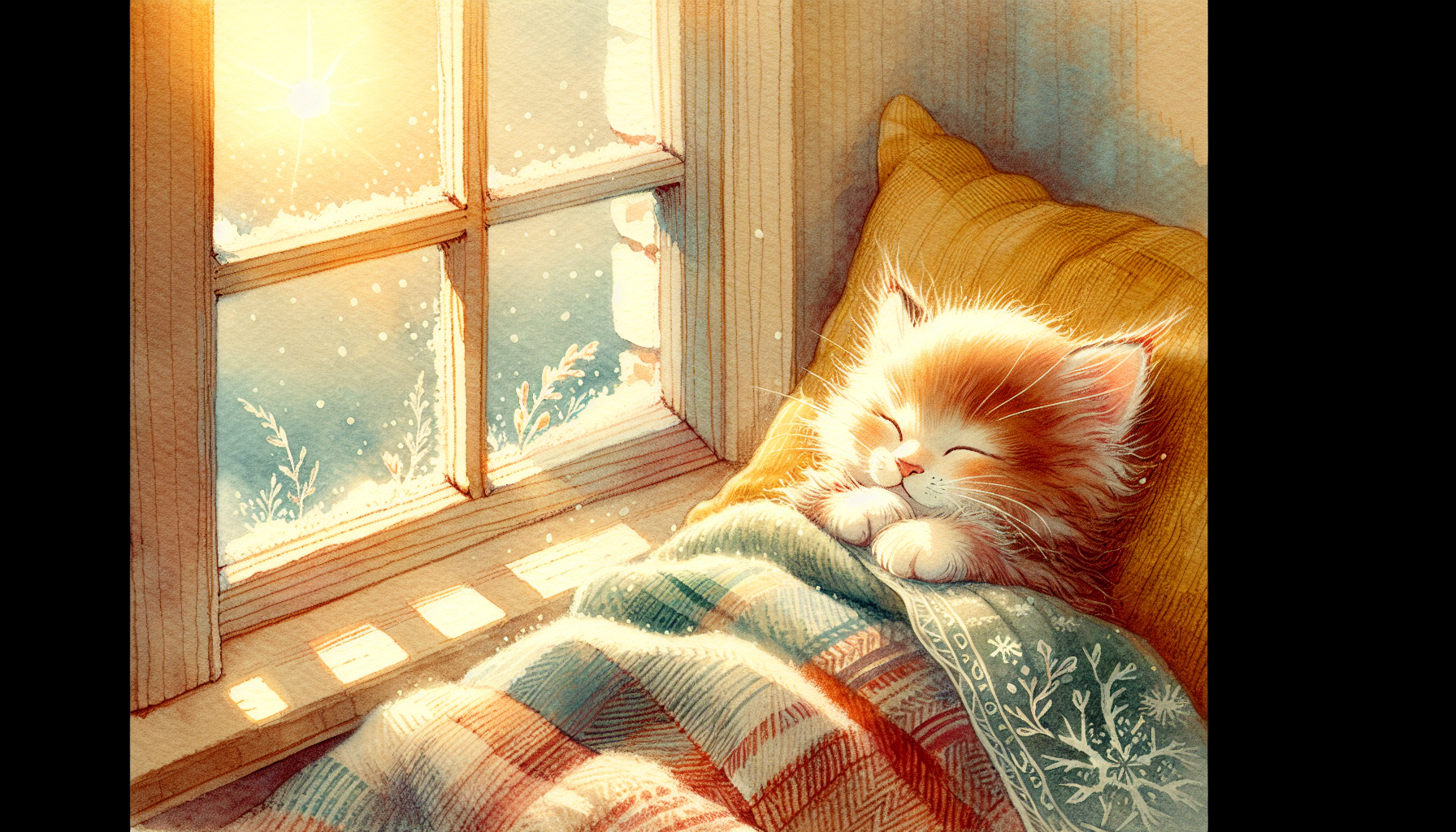 Once upon a time, in a warm little house, there lived a sleepy kitten named Whiskers. Whiskers had soft, fluffy fur that felt like a cloud. Every evening, as the sun dipped low in the sky, he would curl up in his favorite sunny spot by the window.
